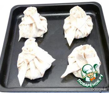 Затем ставим мешочки с начинкой в разогретую до 160 градусов духовку на 20-30 минут. Да, под каждый мешочек на противень положите по маленькому кусочку лаваша, от нарезанной лепешки, так, на всякий случай, чтобы не прилипло.