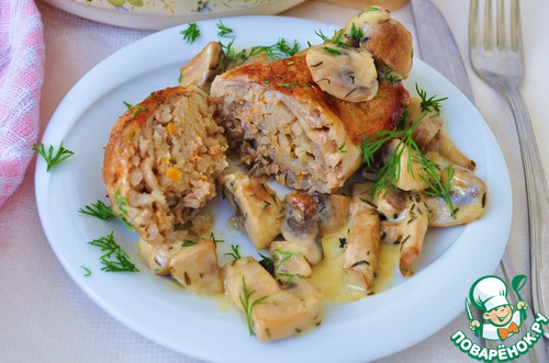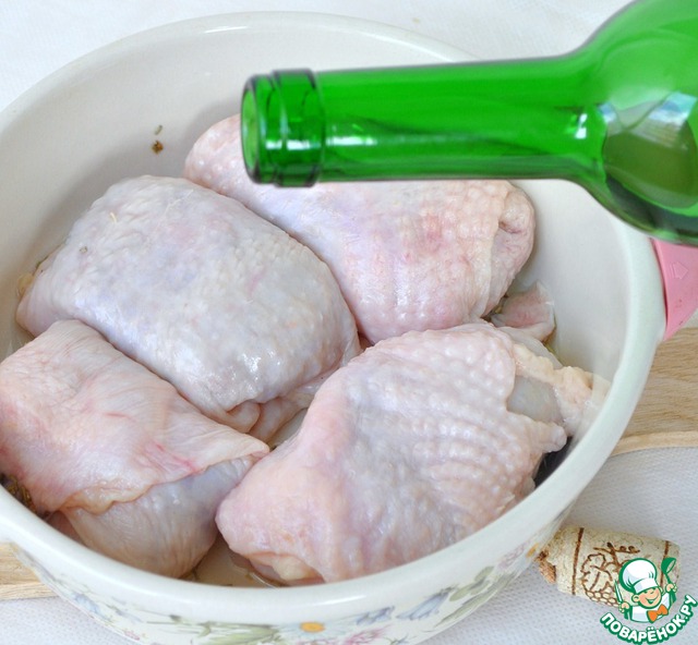 Вливаем вино и бульон. Ставим в духовку, прикрыв фольгой. Через 15 минут фольгу убираем и поливаем жидкостью из формы. Оставляем еше на 20 минут, за это время поливаем фунтики еще раз.