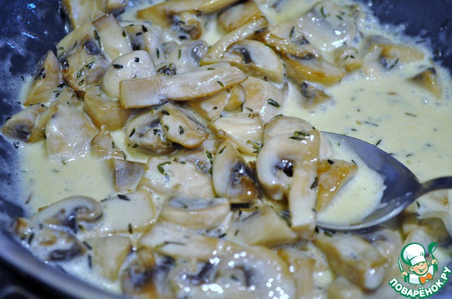 Кладем соль, перец и сливки. Размешиваем и держим на огне, пока не загустеют сливки. Тетерь можно подавать.