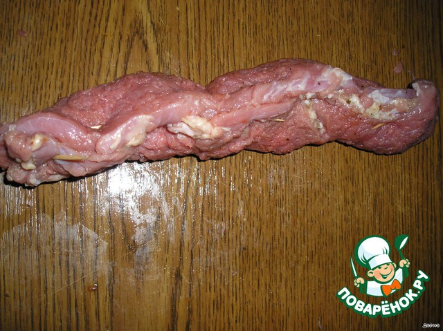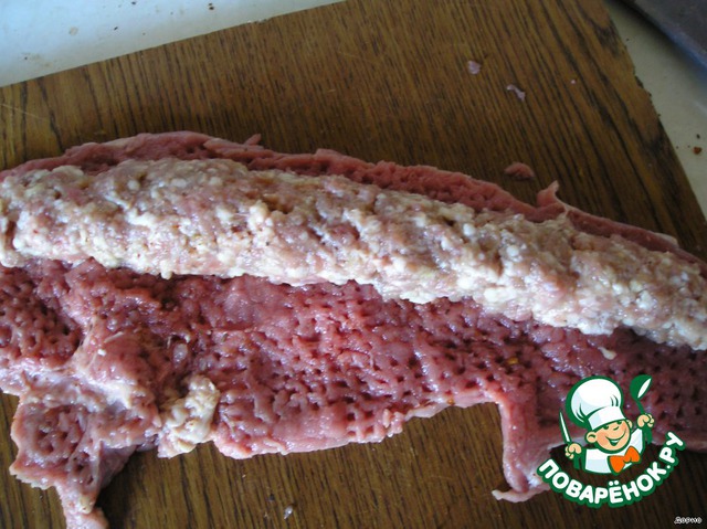 Мяско отбиваем хорошенько с двух сторон. Выкладываем полоску фарша