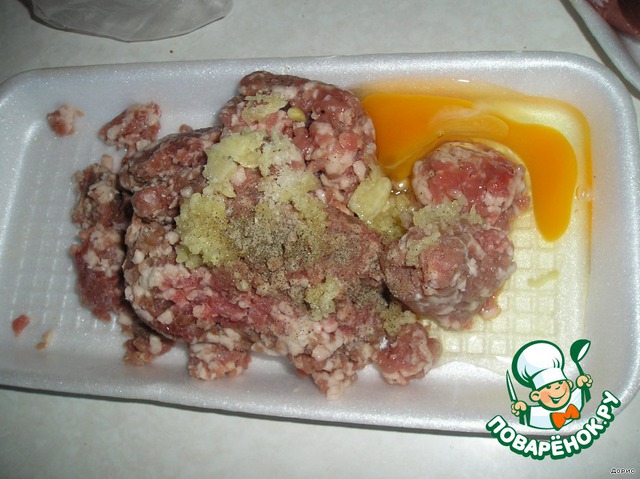 Фарш смешиваем с яйцом, солью, перчиком и выдавленным чесночком