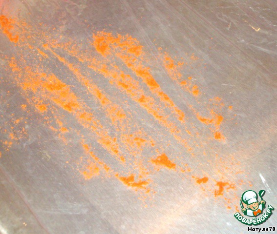 Теперь берем пищевую пленку (сколько не пыталась приобрести, так сказать, кишки - основную упаковку для колбас, ничего у меня не вышло, не продают нигде, пришлось искать выход), отрезаем кусочек около 30 см. Присыпаем чуть-чуть паприкой (можно этого и не делать, но так будет еще ароматней и немного ярче).