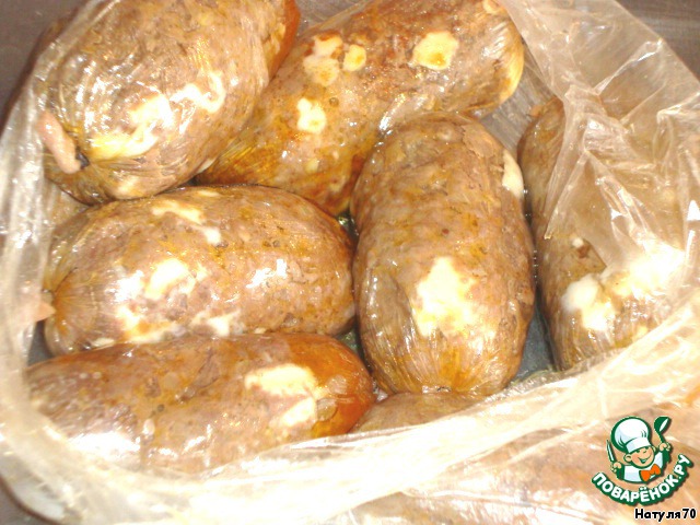 Можно оставить их остывать в пленке, если едоков на данный момент мало). Они прекрасно греются в микроволновке. А если кого-то нужно накормить немедленно, то освобождаем от пленки, нарезаем на кусочки и подаем к столу. Ароматно, вкусно!!!!!