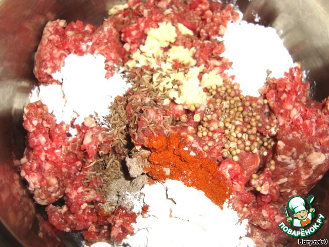 Добавить в фарш крахмал, паприку, тмин, кориандр, чеснок, лук, посолить по вкусу. Тщательно перемешать фарш.