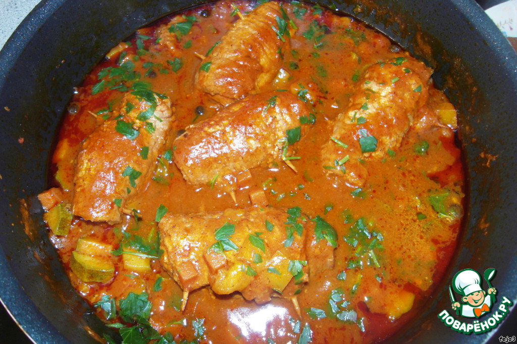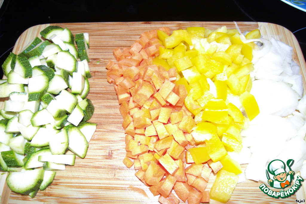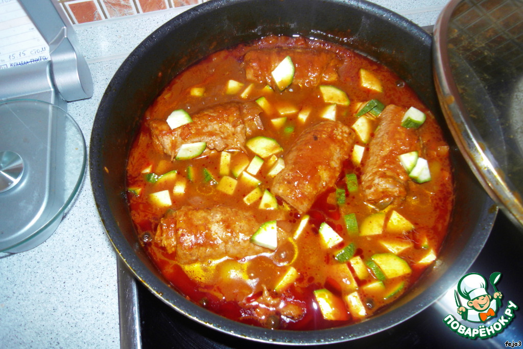 Мясо обжарить с двух сторон. Влить соус и добавить овощи (кроме цуккини) и горошинок 5 душистого перца. Тушим 1 час