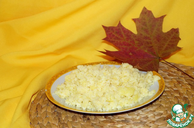 Картофель отвариваем в мундире. Чистим горячим и разминаем толкушкой.