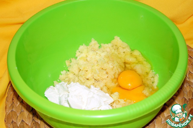 В картофельную массу добавляем яйца, рикотту, натертый на мелкой терке чеснок, солим, перчим, перемешиваем.