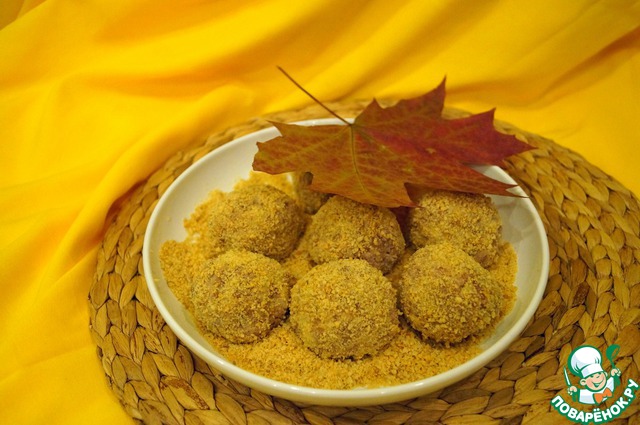 Из полученной массы делаем небольшие круглые польпетты, обваливаем их в сухарях и обжариваем со всех сторон.