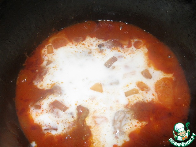 Соус добавляем к мясу. Перемешиваем. Закрываем крышкой и тушим 20 минут (на медленном огне).