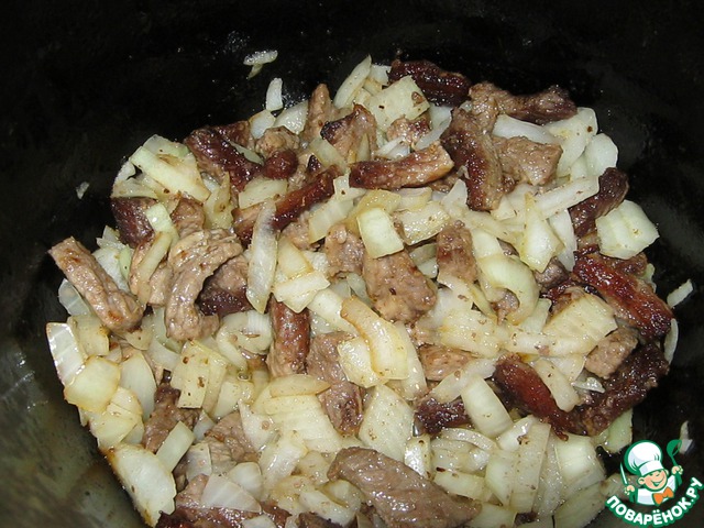 Я немного пережарила мясо (засиделась в Поваренке ))). Лук режем кубиками и добавляем к мясу. Перемешиваем. Приправляем (солим, перчим) и обжариваем 2 минуты.