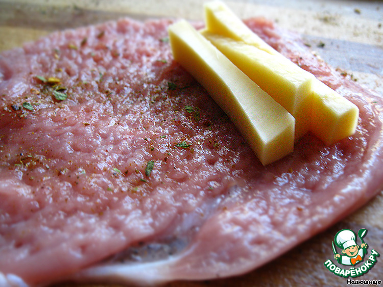 Чуть дальше от середины кладем брусочки твердого сыра.