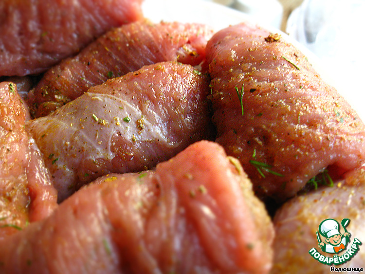 Мясо нарезаем широкими пластинками толщиной в 1 см. Отбиваем молоточком с двух сторон.