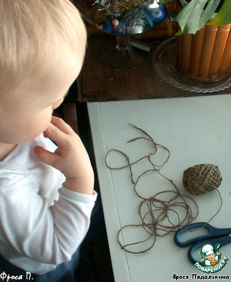 Для рецепта нужен шпагат. Нарезаем его на 5-6 веревочек длиною 30 см. С этой задачей справится даже ребенок :-)