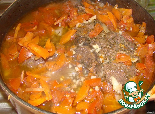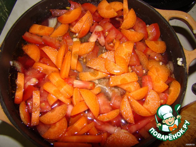 Затем ..перекладываем мясо в кастрюлю для тушения (Я тушу в утятнице ..в духовке)режем в мясо морковь...добавляем томат...вино..воду.закрываем крышкой .И тушим на медленном огне...или в духовке при температуре 220 ..1.5 -2 часа