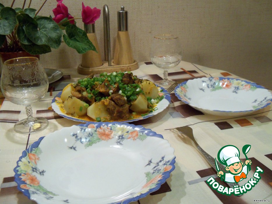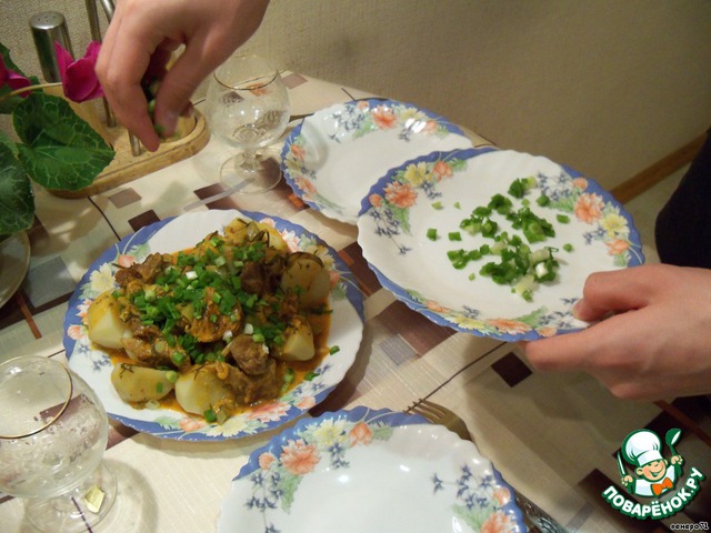 Сам сервирует стол! На блюдо выкладываем картошку, поливаем подливкой и посыпаем мелко нарезанным зеленым луком.