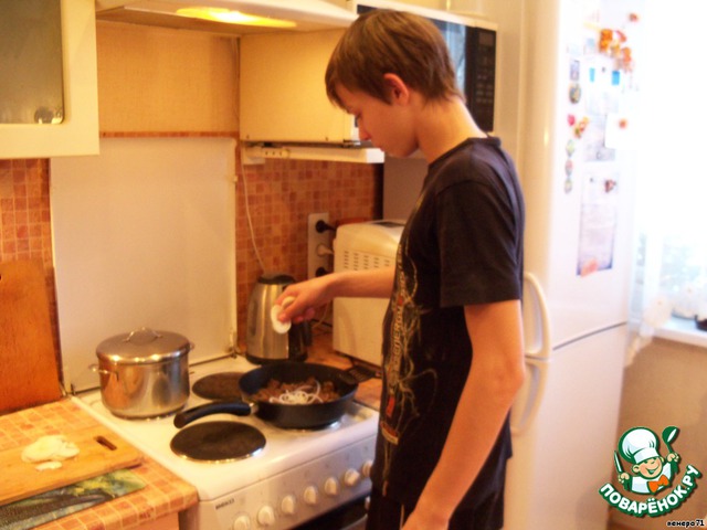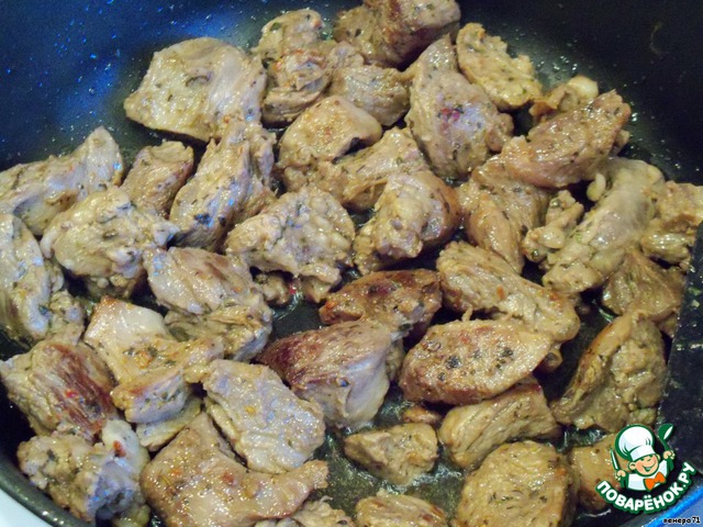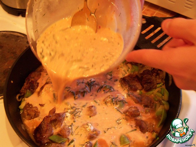 Выливаем соус в мясо.