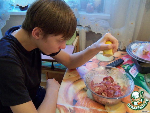 Мясо помыть, порезать некрупными кусочками, посыпать специями и полить соком лимона. Убрать на час в холодильник, пусть отдыхает.