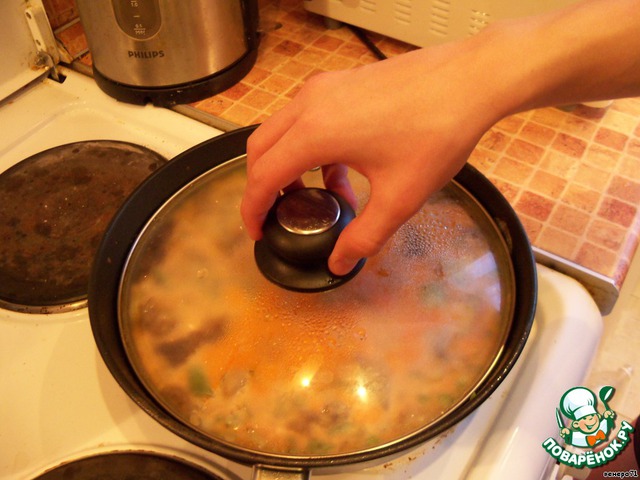 Накрываем крышкой и тушим на небольшом огне до готовности мяса