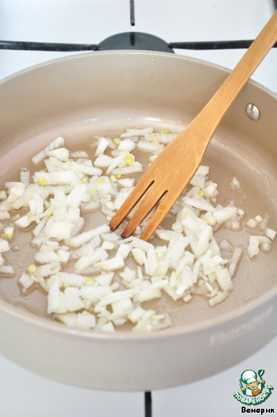 Репчатый лук мелко нарезать кубиками, обжарить в оливковом масле до золотистого цвета.