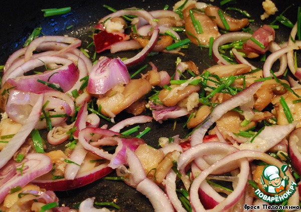 Шампиньоны нарезать тонкими ломтиками, зеленый лук - кусочками, красный лук - кольцами. В глубокой сковороде растопить половину сливочного масла, положить грибы, лук (оба) и выдавить чеснок. Жарить в кипящем масле примерно 5 мин.