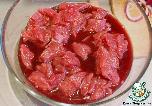 Говядину обмыть, удалить жир, нарезать небольшими кусочками. Залить вином и оставить мариноваться, пока готовятся овощи.