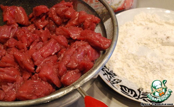 В тарелке смешать соль, перец, муку. Разогреть сковороду с оставшим сливочным маслом. Говядину достать из маринада, откинуть на дуршлаг, маринад сохранить. Когда стечет, обвалять в муке. Обжаривать, пока мясо не подрумянится - 4-5 мин.