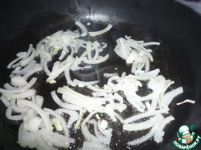 Поджарить лук, порезанный полукольцами.