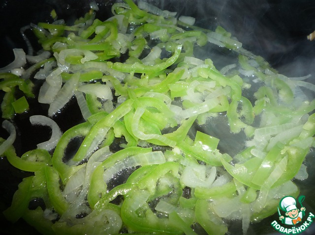 Добавить тонко порезанный перец. Помешивая, продолжаем жарить минуты 2.