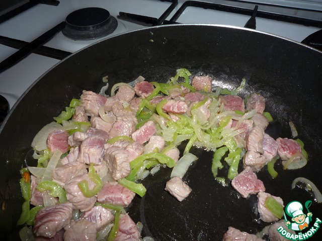 Затем добавить небольшие кусочки говядины, тушить мясо минут 15-20. Можно добавить немного воды.