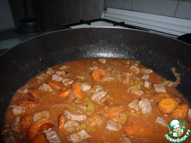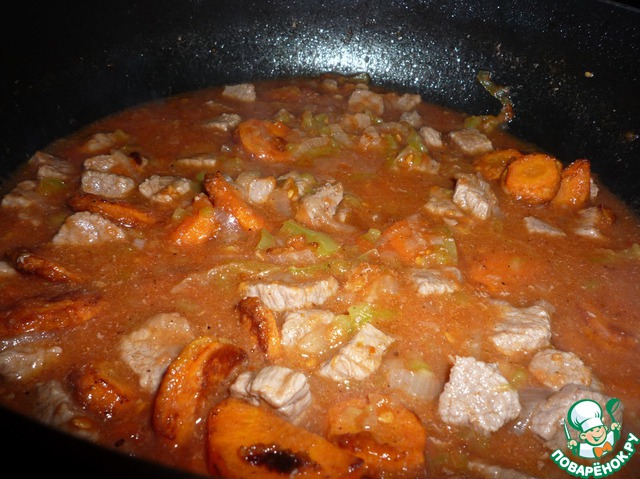 | Korsan Guveci. Это блюдо называется Пиратский Гювеч, потому что поджаренные морковные колечки похожи на монеты. Настоящий гювеч готовится в глиняных горшках. Но попробовала приготовить в сковороде. |