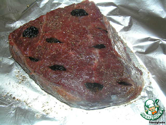 4. Нашпиговываем говядину черносливом, засовывая сливы внутрь поглубже.