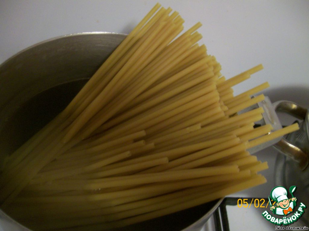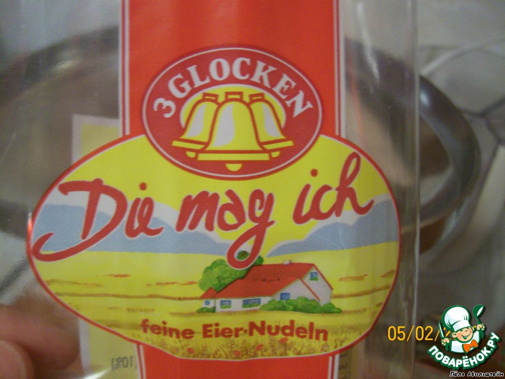 Начнем с макарон. Так удобнее, чтобы потом не отвлекаться от процесса приготовления соуса. У меня сегодня вот такие немецкие макароны "Три колокольчика". Иногда использую Шебекинские. Вы берете макаронные изделия, которые Вам по вкусу.