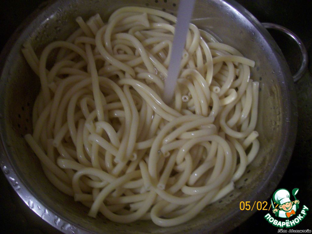 Накладываем в тарелку макарончики, можно немного подогреть в микро. Но если будете заливать кипящим соусом, можно не греть.