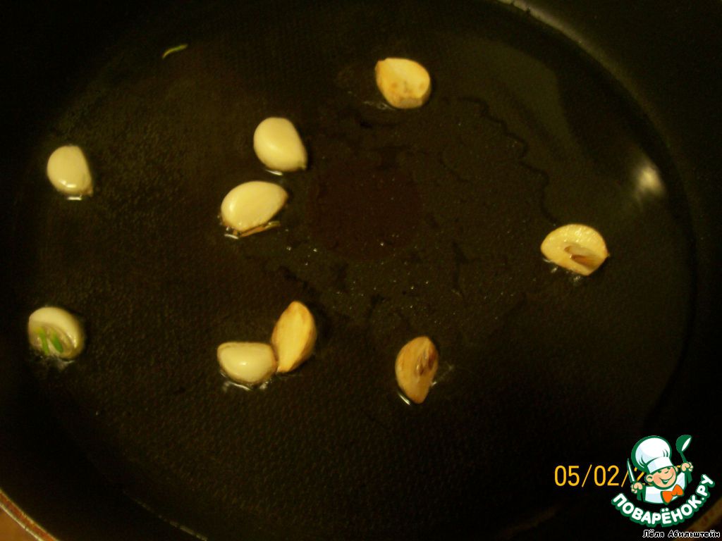 Теперь чеснок. Здесь остановлюсь поподробнее. Нам нужно его быстро обжарить на сковороде, чтобы он отдал свой аромат маслу, и ВЫКИНУТЬ. Этот совет повара из Галилео я оценила на 5+! Во всех встречающихся мне до сих пор рецептах чеснок или обжаривается с луком, или выдавливается в почти готовый соус. Однако, это дает более резкий вкус и горчинку жареного чеснока (если его не удалить после обжаривания).