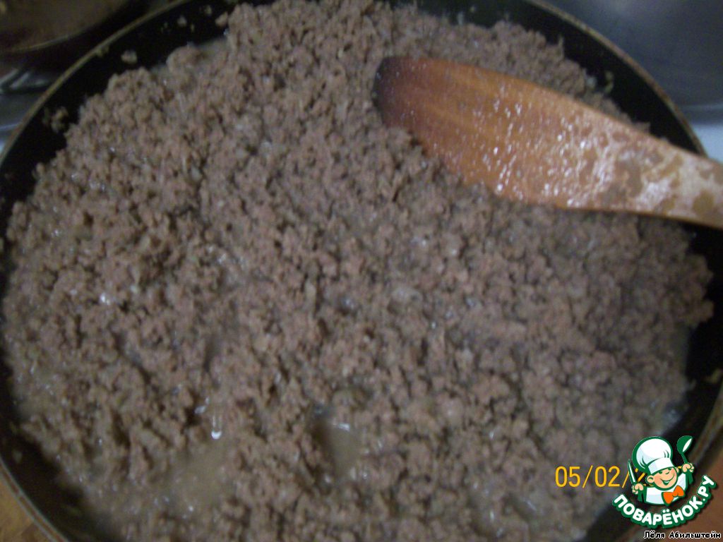 Фарш с луком обжариваем до момента, когда выпарится вся жидкость. Если блюдо готовится только для взрослых, можно обжарить посильнее.