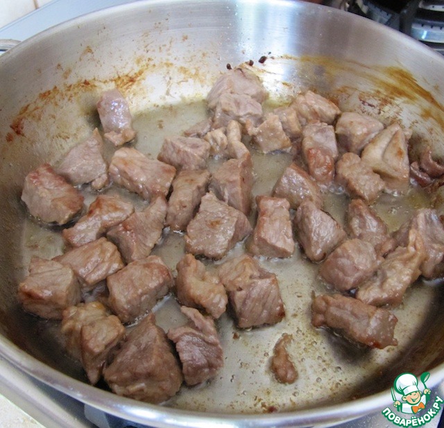 В сотейнике (или глубокой сковородке) разогреть растительное масло и обжарить кусочки мяса.