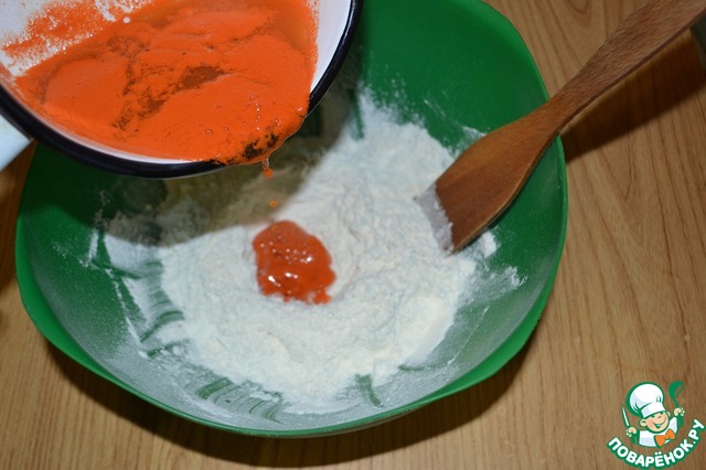 Для приготовления теста муку нужно высыпать в миску горкой и сделать в ней углубление. Довести морковный сок до кипения, влить в центр муки