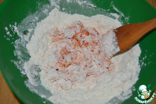 И быстро перемешать деревянной ложкой, чтобы сок и мука соединились