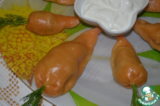 Укладываем готовые «морковки» на смазанный маслом поддон пароварки, швом вниз и укрываем их влажной салфеткой, чтобы не высыхали. Также делаем «морковки» из остального теста и начинки.
