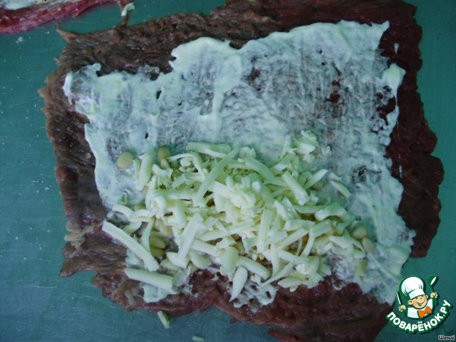 Вырезку посолить и поперчить, смазать майонезом и чесноком, уложить сыр и кедровые орехи и свернуть рулетом.
