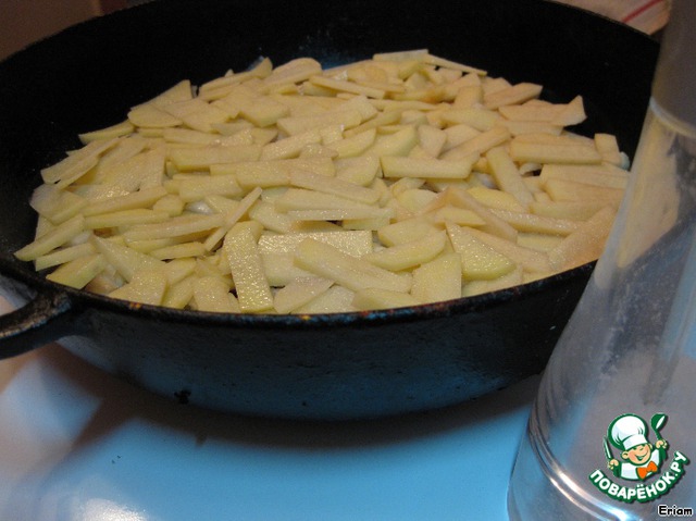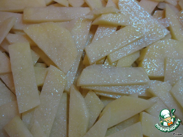 Картофель очистить, порезать как на супчик (соломкой), покрошить половину порции вот в такой толщины слой!