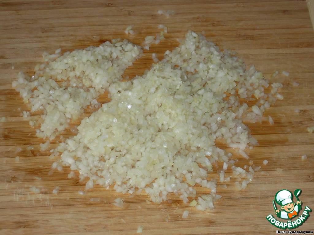 Лук нарезать очень мелко и обжарить в растительном масле до легкой золотистости.