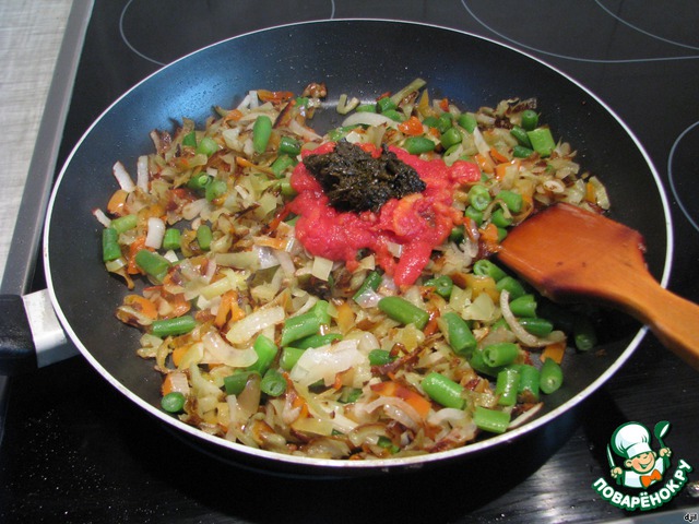 , лук, томат (протереть через сито), укроп. Готово? В кастрюлю к мясу с баклажанами! Тушим 30 мин.