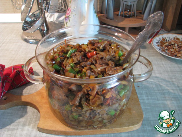 Итак, после проведения ревизии морозилки я решила сделать говядину тушеную с овощами. Мясо режем, отбиваем, обжариваем, солим-перчим (не сильно), выкладываем в жаропрочную кастрюлю, заливаем кипяченой водой и в духовку на 180 гр. Обжариваем баклажаны (у меня все овощи были замороженые, сначала размораживаю, потом хорошенько отжимаю и затем на сковороду), добавляем лук и жарим на не большом огне мин. 5. Перекладываем в чашу и кладем чеснок выдавленный. В конце 1 ст. ложку бальзамического уксуса, хорошенько перемешать и присоединить к мясу. Далее беремся за перец