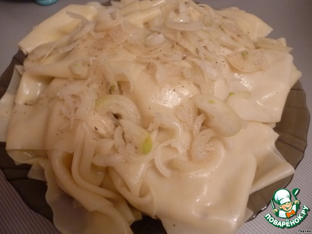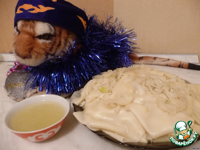 Я воспользовалась готовыми, это удобно. Если нет возможности, то замесите тесто: из муки, бульона, 2-х яиц и соли. Разделите тесто на несколько частей. Каждую часть тонко раскатайте, дайте подсохнуть и нарежьте прямоугольниками.