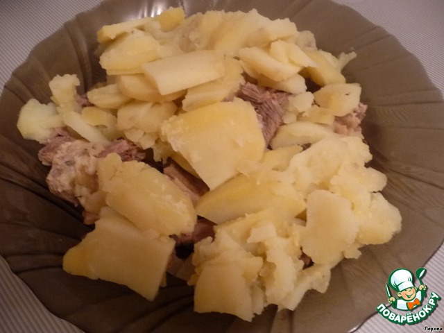 2. Когда мясо готово, отвариваем на том же бульоне средне порезанный картофель.