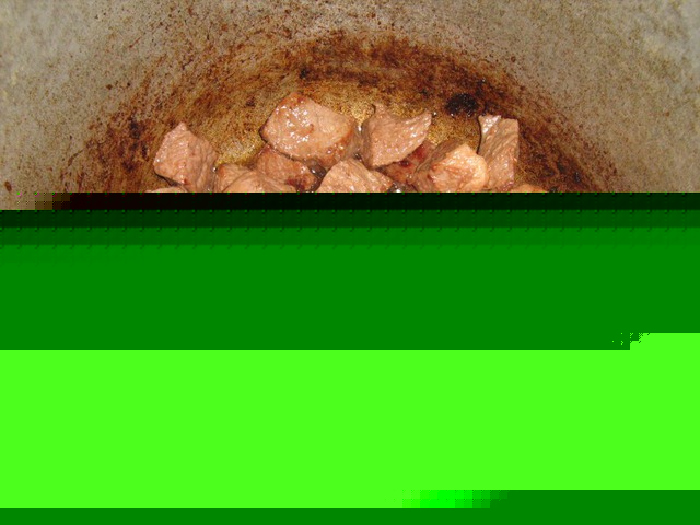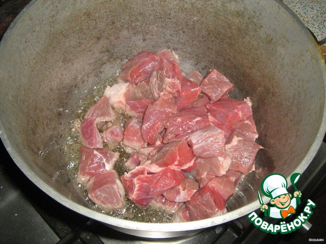 В кипящее масло положить мясо. Всё жарим на сильном огне
