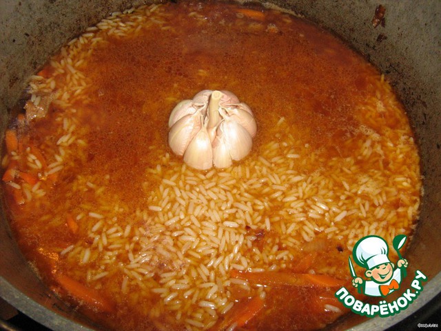 Добавляем наш уже разбухший рис (остатки воды из риса слить). Жидкости должно быть на два пальца больше содержимого, в середину положить головку чеснока. Варить под закрытой крышкой на сильном огне до выкипания жидкости. Как жидкость выкипит (но не полностью), огонь убавить на минимум и варить до полного приготовления риса. Если вода выкипит, а рис будет жестковат, то воды следует добавить. Содержимое не мешать и следить, чтобы не пригорело.