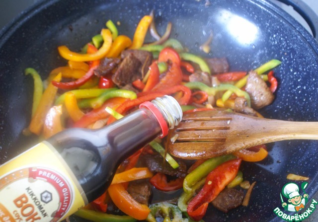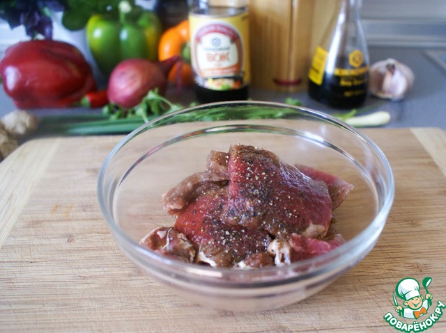 Говядину нарезать тонкими пластинками либо брусочками и замариновать в смеси соевого соуса, растительного масла и черного перца.