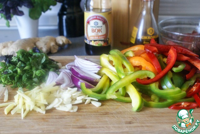 Перцы нарезать полосками, перец чили - колечками, красный лук - перьями, имбирь - тонкой соломкой, чеснок - тонкими пластинками. Порубить зелень.